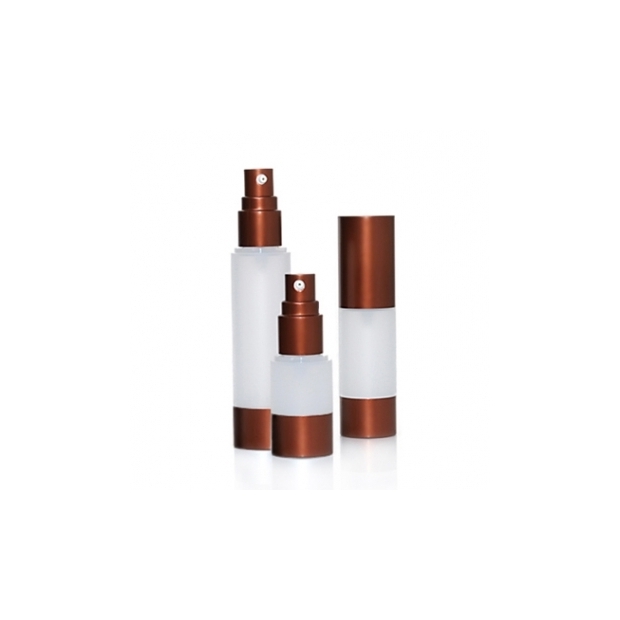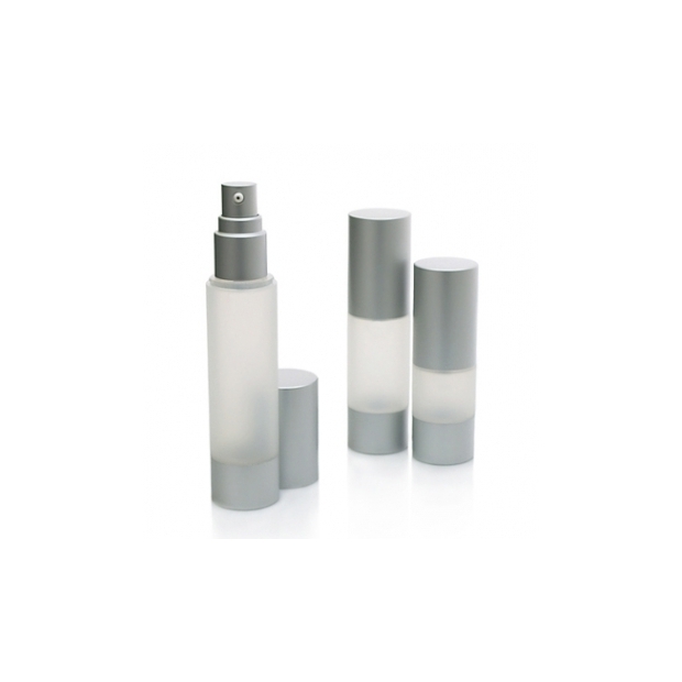 Image Shown (2): Bottle Molded in PP in Frosted Finish with Custom Color Metal Cap, Pump and Base