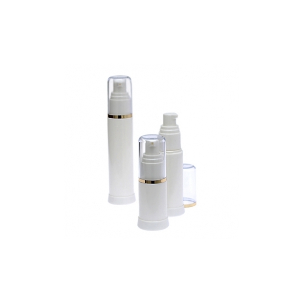 Image Shown (2): Bottle Molded in PP with Bottle and Base in White Finish, Clear Cap with Gold Band and White Pump
